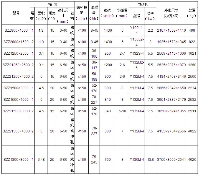 ——篩機分單層和雙層,除了SZZ1800×3600振動篩外都為吊式。